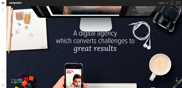 本例中,我們可以看到大量的圖像背景和視差效果。菜單圖標放置在大標題的右上角,打開后有非常詳盡的導航菜單指向其他板塊。